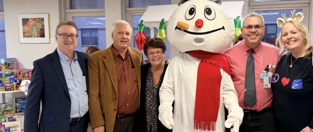 (L-R) Joel Sturm, Dr. Michael Trepal, Kathy Trepal, Frosty the Snowman, Drs. Russell Volpe and Kathy Reilly Fallon |