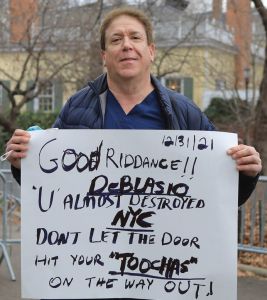 Outside Gracie Mansion Friday, Mayor Bill de Blasio’s soon-to-be-former neighbors on Manhattan’s Upper East Side were overjoyed today to see him finally packing up and preparing to leave. Neighborhood podiatrist Sam Carr, DPM, used his Friday lunch break to stand outside Gracie Mansion with a sign that bid de Blasio “Good Riddance!!” and warned: “Don’t let the door hit your ‘toochas’ on the way out!”