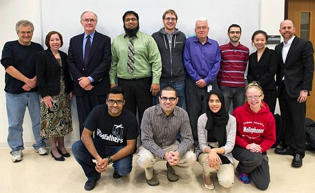(Back Row L-R) Robert Intine, PhD; Nancy Parsley, DPM, MHPE; Ronald Sage, DPM; Rashad Sayeed; Adam Baron; Bruce Manion, PhD; Jonathon Matzkin-Bridger; Stephanie Wu, DPM, MSc; and Ryan Crews, MSc. (Front Row L-R) Shrunjay Patel, Ramin Ghazizadeh, Farheen Wahid, and Cassey Crowell.