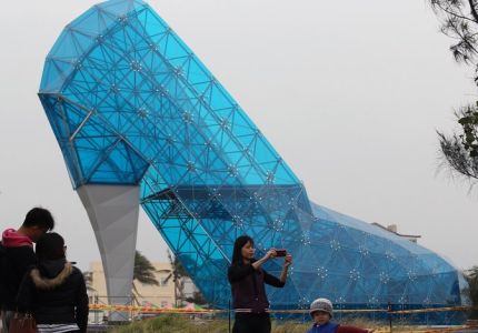 Imagine Cinderella's glass slipper scaled to about 100 times its original size and dropped on the coast of Taiwan. That's the new church in Ocean View Park in Budai township. Looking like it was plucked from a distorted fairy tale, the glittering, shoe-shaped building is made up of about 320 tinted glass panels and stands 55 feet tall by 36 feet wide.