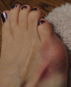 A 49 year old healthy female presented in Sept. 2013 concerned about a cyst on her foot, but went on to describe intermittent acute onset of pain and bright redness in the area of the 5th MTPJ, and sometimes occurring in various joints of the fingers. Interestingly, it occurred in various IPJs of her fingers, but only the 5th MTPJ of her foot. She related that it only occurred about two times per year with no obvious cause or trigger. She then showed me a picture and the erythema around the 5th MTPJ was extremely bright with no edema.