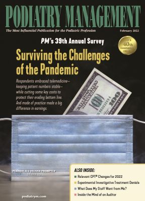 We've just mailed the February 2022 issue of Podiatry Management. The cover story is titled "PM's 39th Annual Survey: Surviving the Challenges of the Pandemic." In addition, you'll find our usual assortment of columns and features.