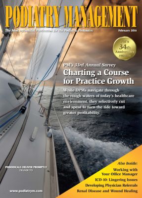 We've just mailed the February 2016 issue of Podiatry Management. Our cover story is titled "PM's 33rd Annual Survey: Creating a Course for Practice Growth." In addition, you'll find our usual assortment of features, including our columns and a CPME-approved CME.