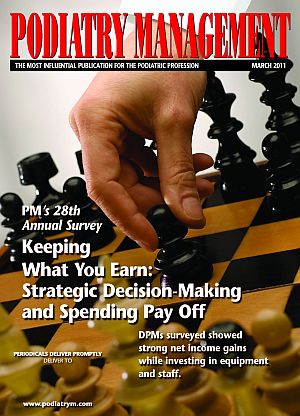 We've just mailed the March 2011 issue of Podiatry Management. This 220-page special Annual Survey issue includes our cover story, "Keeping What You Earn: Strategic Decision-Making and Spending Pay Off," a roundtable discussion, "Degree Change: Has Its Time Come?" as well as an assortment of features, including our informative columns, and a CPME-approved CME.