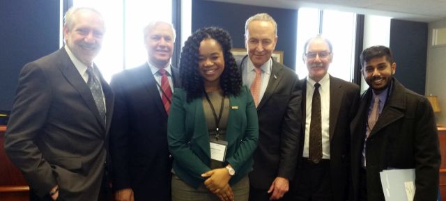 (L-R) Drs. Robert Goldberg and Michael Trepal; Gabriell Jasmin, Senator Charles Schumer (D-NY), Dr. Peter Dane, and Mikail Kamal. |