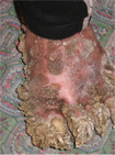 Lewandowsky-Lutz dysplasia is a form of epidermodysplasia verruciformis, an extremely rare skin disease characterized by the growth of scaly macules and papules, particularly on the hands. It is named after doctors Felix Lewandowsky and Wilhelm Lutz. The condition begins in childhood and has no known cure. It is believed to be caused by the HPV in combination with a genetic predisposition. It looks more like a PPK with 'horny' hyperkeratosis, which is an autosomal-dominant disease. I’m not really sure this would be considered Lewandowsky-Lutz dysplasia, which is viral. Many times I've seen similar conditions with fungal and viral infections superimposed over a genetic hyperkeratosis. It may be more in line with Unna Thost disease. The jury is still out on this Internet post .
