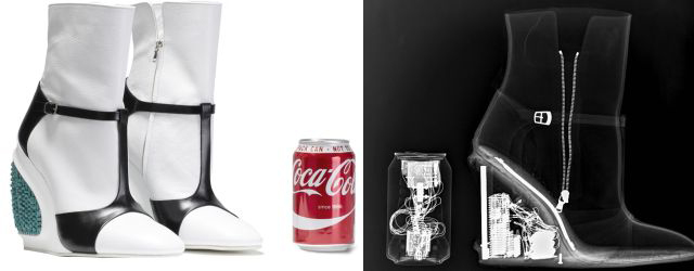 Concealed as a design detail and woven into the back of the wedge on this black and white T-strap is a gunpowder-fuse trim. This fuse can be activated from up to 20 meters away and is detonated wirelessly by opening, pretending to drink, and then crushing the accompanying soft drink can.