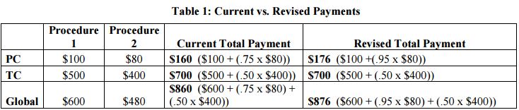 Effective January 1, 2017, MACs shall pay 95 percent of the fee schedule amount for the PC of each additional procedure furnished by the same physician (or physician in the same group practice) to the same patient, in the same session on the same day. The current payment, and the payment as of January 1, 2017, are summarized in the example table below: