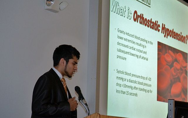 Loyola student and ANKLE member Samar Khan presents his research concerning novel objective assessments of the effect of orthostatic hypotension upon balance and neuromuscular control. Khan was mentored by Scholl student Michael Roum and CLEAR member Associate Professor Dr. Bijan Najafi. |
