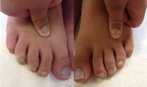 Has anyone seen this condition, especially in a child? What is the diagnosis and treatment? Scrapings and cultures have been taken and I am awaiting results. It looks like onychomycosis. Any suggestions and help would be appreciated.