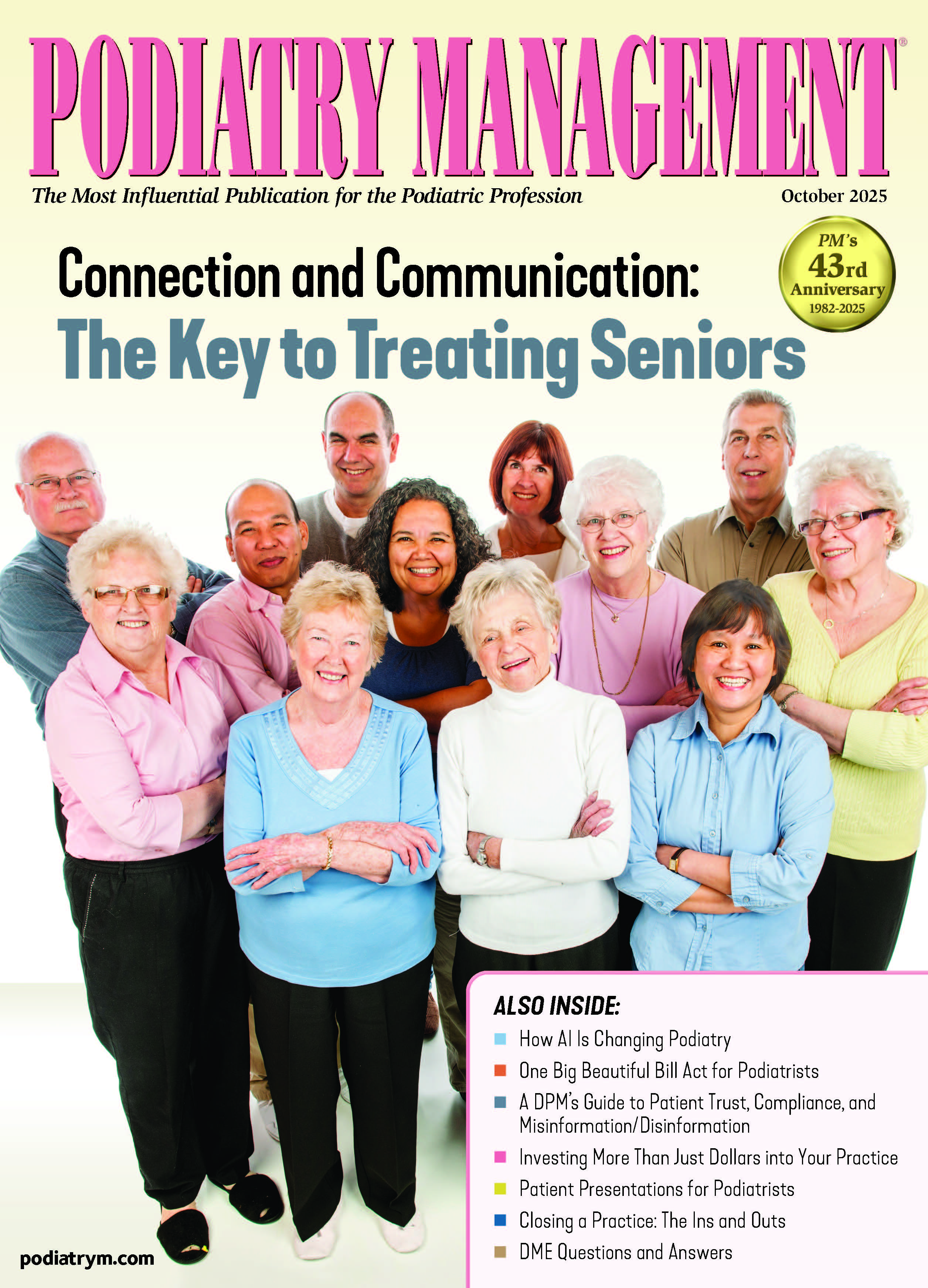 We've just mailed the October 2025 issue of Podiatry Management. The cover story is titled, "Connection and Communication: The Key to Treating Seniors". In addition, you'll find our usual assortment of columns and features. The October CME can be found online.