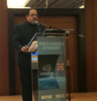 FIP President, Dr. Joseph Caporusso delivered his opening address at the FIP World Congress of Podiatry in Rome, Italy on October 17th 2013. Dr. Caporusso said, "This has been the best turn-out to date with over 1,000 participants from 40 different countries." Participants consisted of podiatrists, orthopedic, vascular, and general surgeons, dermatologists, and an interventional radiologist. Even the Sultan of Brunei got involved by sending several podiatrists through the offices of his Ministry of Health.