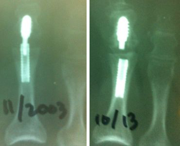 These x-rays represent the attempted PIPJ fusion performed by me 10 years ago. This was back when insurance companies actually paid single specialty surgery center fees very much as they did multi-specialty ones, and it was not a cost issue to use digital implants. I recently saw this patient for a 10-year follow-up. She was very happy with her surgery and had no specific complaints. Digital implants do not last forever, and do not count on them alone to give your digit stability.