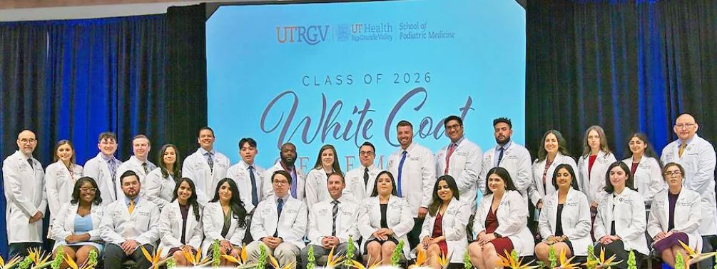 Students in the inaugural cohort of the UTRGV School of Podiatric Medicine donned their white coats for the first time, marking their official participation as student-doctors. The school’s first White Coat ceremony, held Oct. 28 at the Harlingen Convention Center, introduced the 27 students of the Class of 2026.