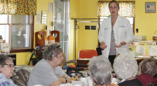 Ashley Smith, DPM, a surgical podiatrist at the Lawrence County Memorial Hospital, spoke to seniors during the monthly Dine With a Doc program Friday. The program is held on the first Friday of each month at the Lawrence County Senior Center and features a different doctor with a topic related to senior health and needs.