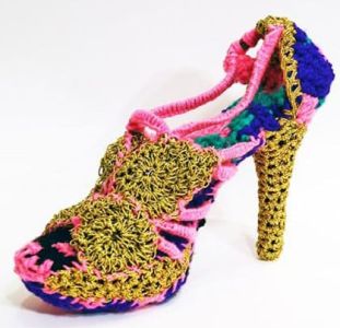 Olek is known for her large encompassing crocheted works and now she has scaled down to create a series of footwear, including this peep toe shoe, using the same technique executed in her signature colors and camouflage style.