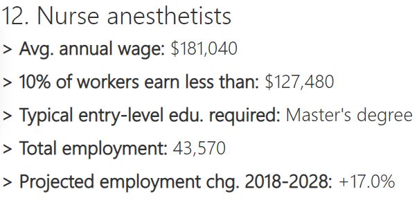 The nurse anesthetists are 10 spots ahead of us on the income list, make, on average, nearly $40,000 a year more than we do, have no overhead, require much less schooling than we do, and never have to see the patient again. Can't wait until the next patient tells me I am overpaid.