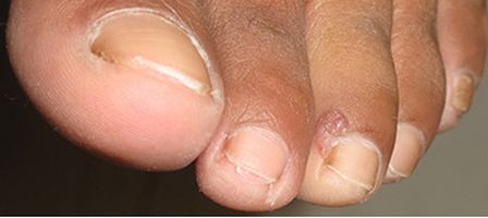 Purple toe lesion 3rd digit (photo: Jonathan Karnes, MD) |