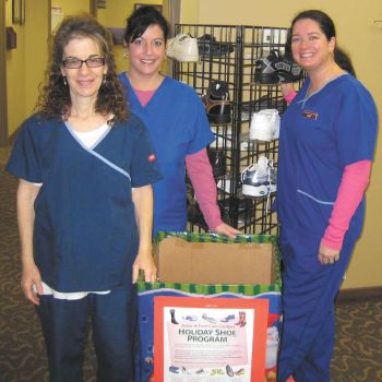 Promoting the annual holiday shoe drive sponsored by podiatric physicians and staff at Ankle & Foot Care Centers are, from left, Geri DeCenso, Lisa Troutman, and Amy Assion, staff members at the group’s Market Street office, one of 19 Mahoning Valley locations.