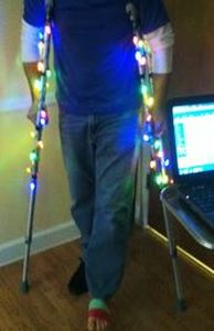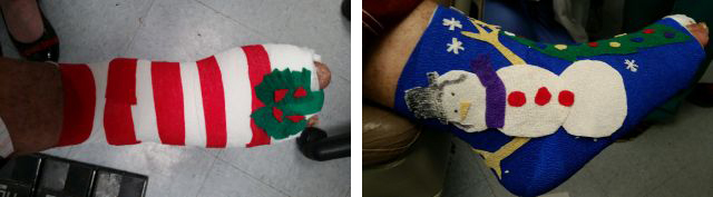 This patient came in for his first post-op visit using his crutches. He obviously was not going to let foot surgery interfere with his festive holiday spirit. Note: the lights were battery-operated.