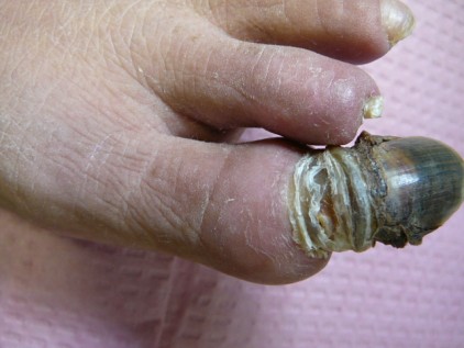 He developed gangrene of the distal portion of all 10 toes. Since then, the distal tips of the toes have self-amputated except for the left hallux. The toenail is still growing from the matrix, and it appears that the uncut toenail is the only thing connecting the petrified portion of the toe to his body. I am not sure why he presented, since he refused permission to attempt to remove the remainder!