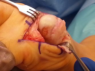 I find the objective findings to be a bit puzzling. If intrinsic muscle i.e., the FDB, plantarflexed the head of the proximal phalanx, the distal portion of the toe would either be through the ground or dorsally subluxed. In the picture shown, the toe looks like an average hammertoe, other than the lesion. There does not appear to be any dorsal dislocation of the distal end of the toe. How exactly could the head of the proximal phalanx be plantarflexed otherwise? In traditional hammertoes, the head of the proximal phalanx are dorsiflexed.